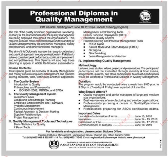 Professional Diploma in Quality Management in PIM Karachi