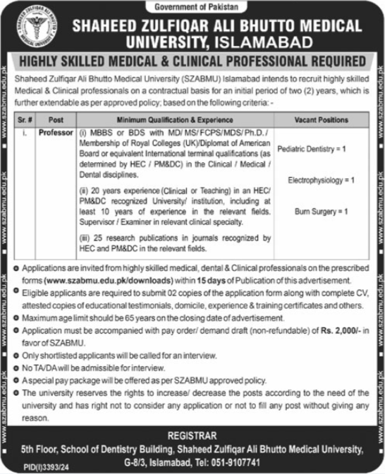 Shaheed Zulfiqar Ali Bhutto Medical University SZABMU invites applications for job positions advertised in daily Ausaf dated 19 November 2024 for following vacancies in Islamabad, islamabad Islamabad Pakistan.