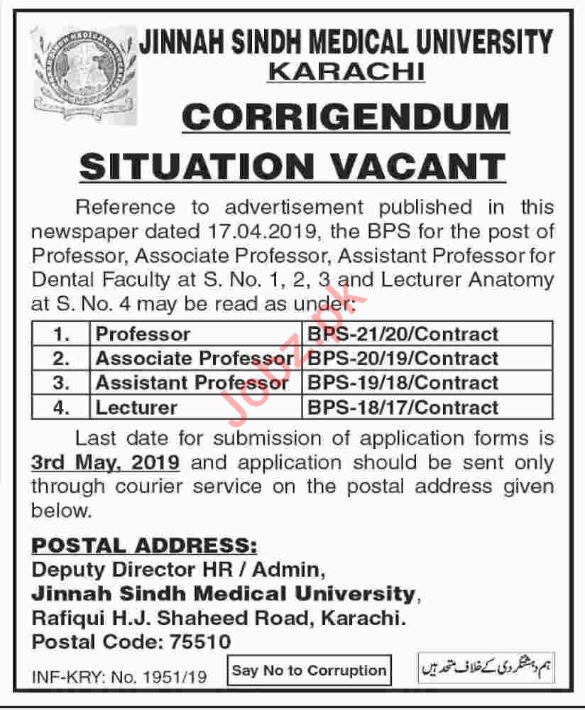 Vacancies in Jinnah Sindh Medical University Advertisement April 2019
