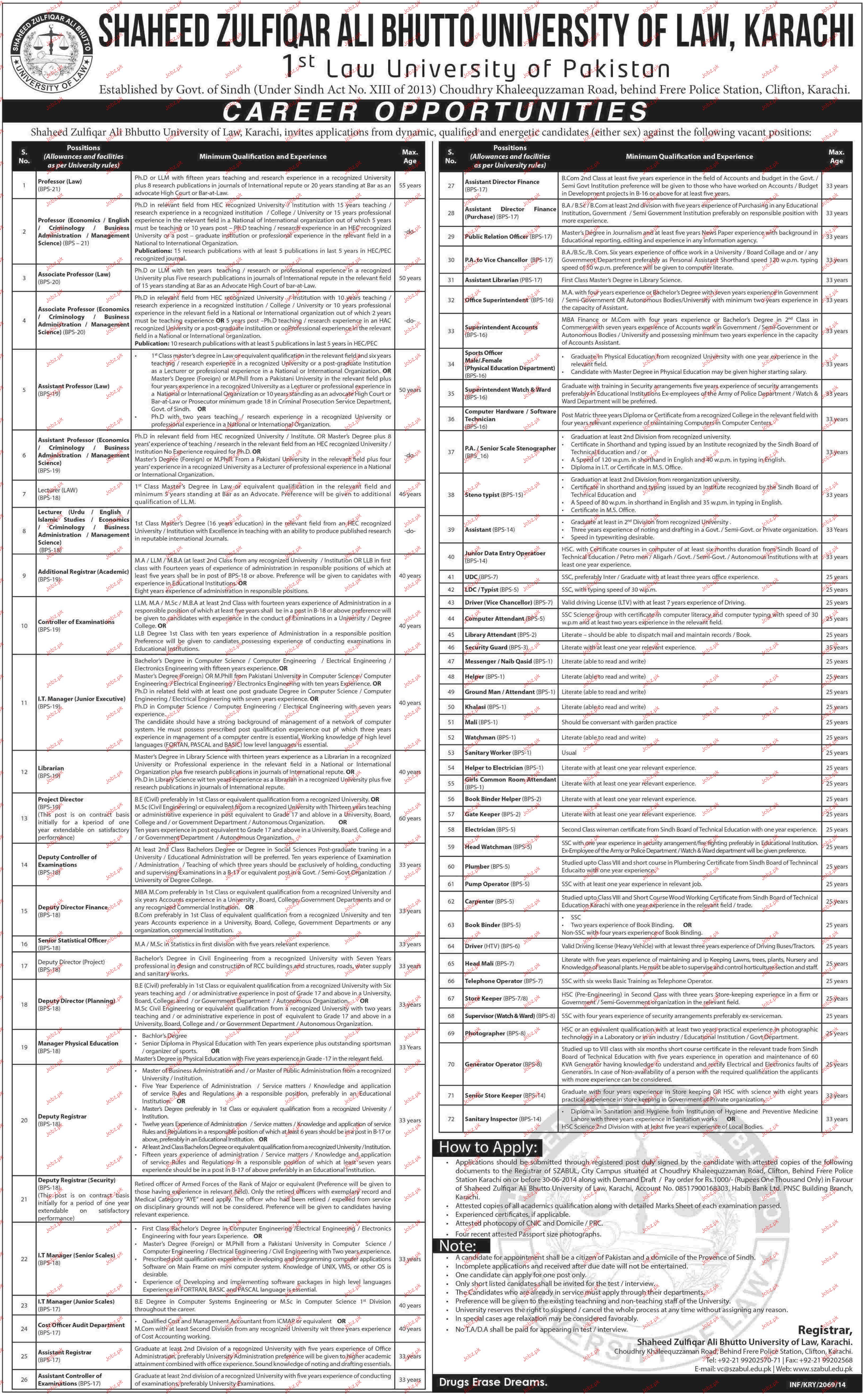 Professors, Associate Professors, Assistant Professor, Lecturers, Controller of Examinations, IT Managers, Librarian, Project Directors, Deputy Director Finance, Senior Statistical Officer and Deputy Registrar are required in Shaheed Zulifqar Ali Bhutto University of law in Karachi.