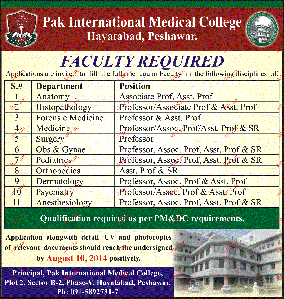 Professors, Associate Professors and Assistant Professor are required in Pak International Medical College in Peshawar.