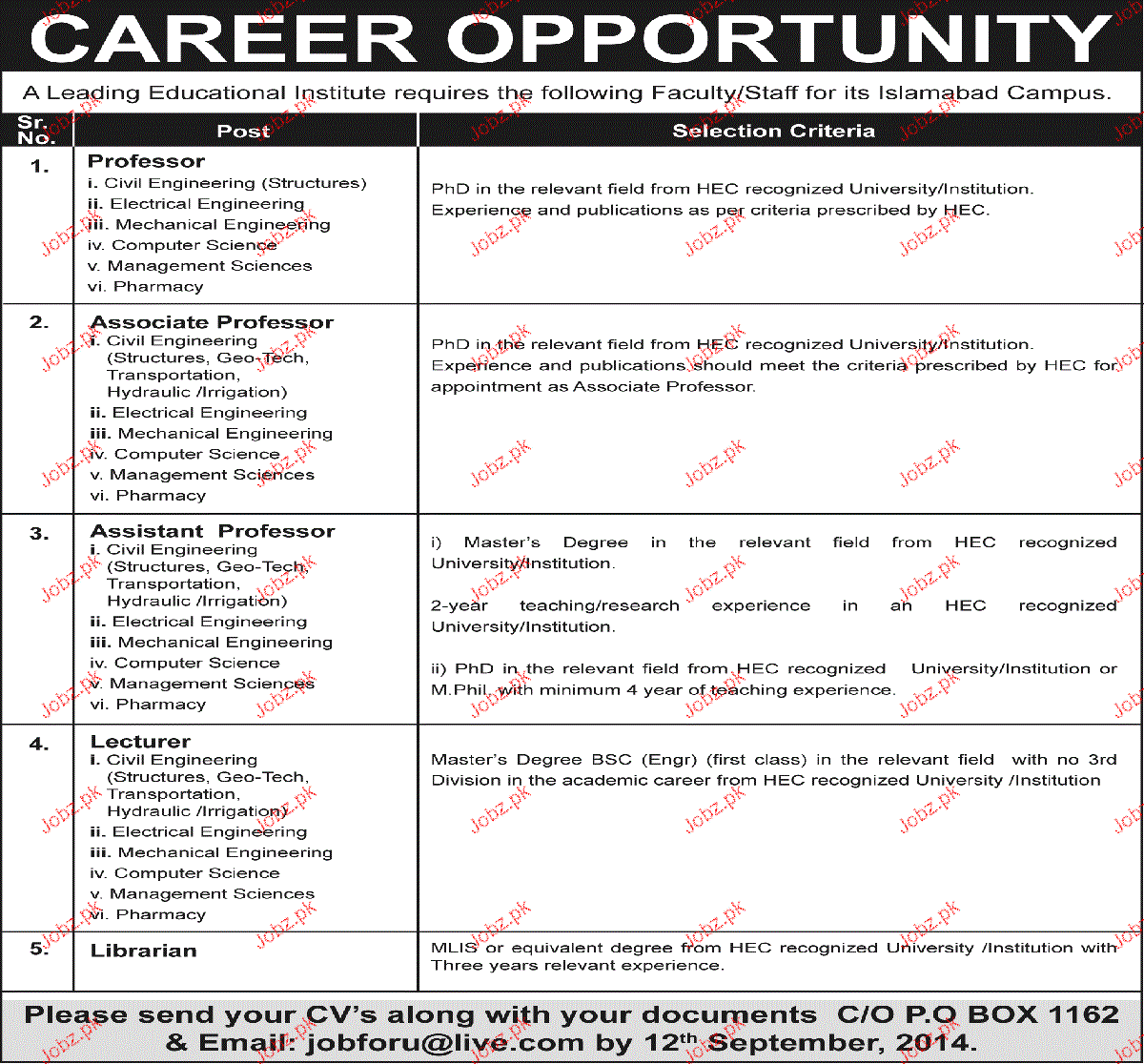 Professors, Associate Professors, Assistant Professor, Lecturers and Librarian are required in Islamabad.