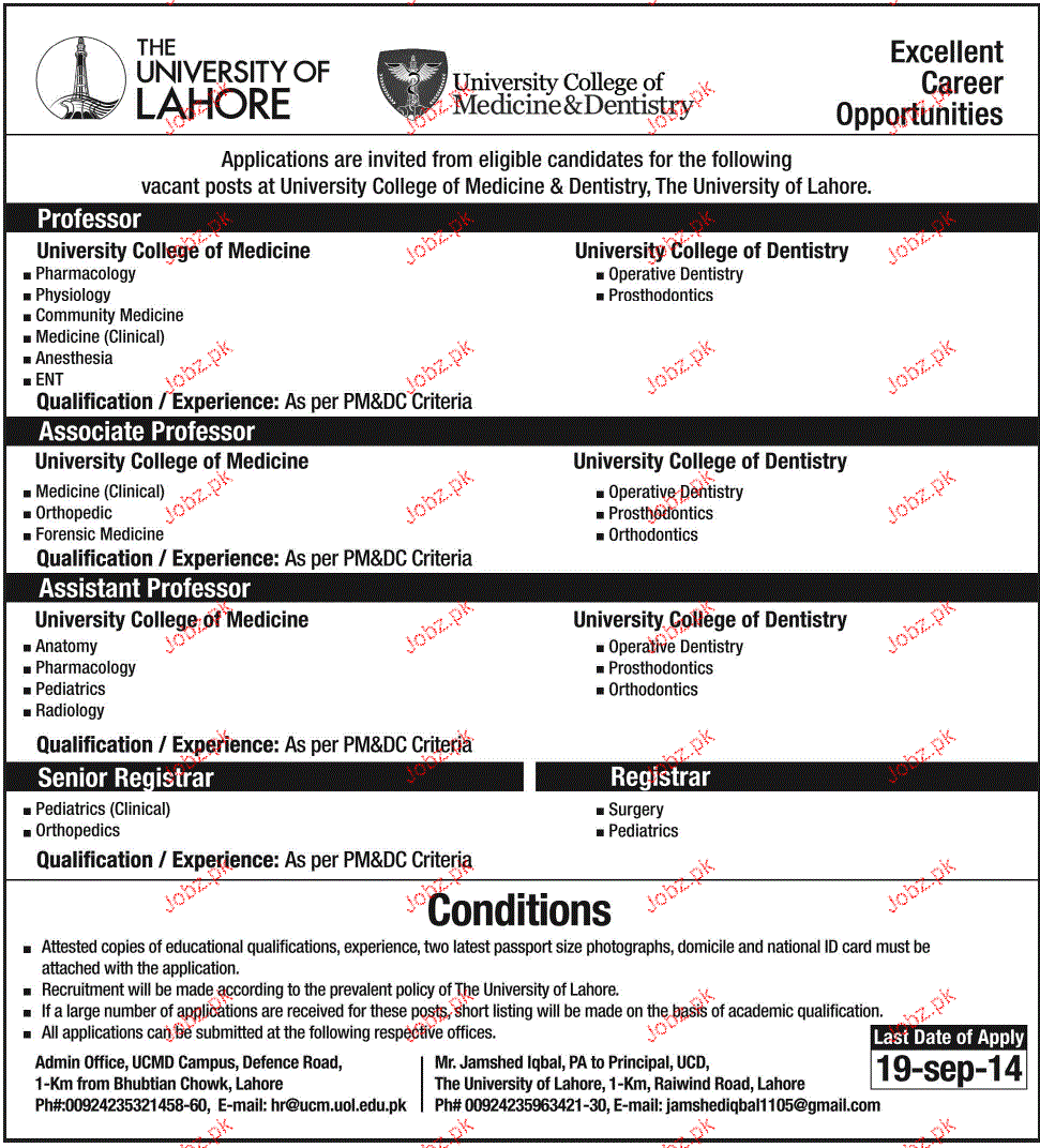 Professors, Associate Professors, Assistant Professor and Senior Registrar are required in The University of Lahore in Lahore.