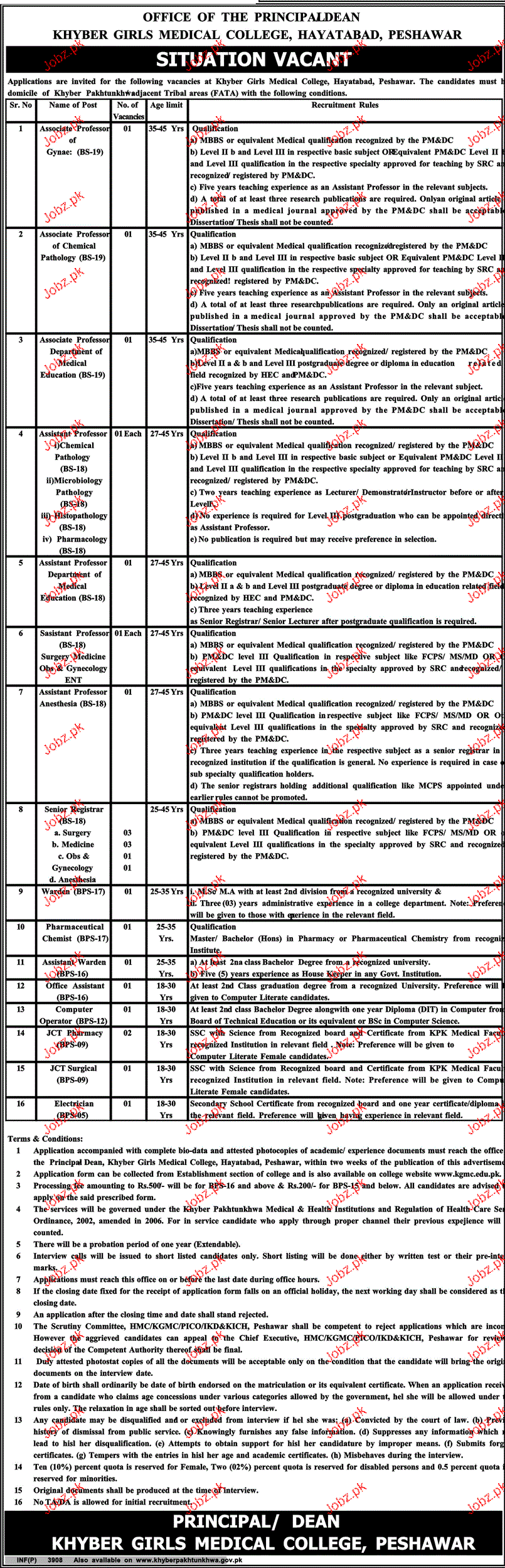 Professors, Associate Professors, Assistant Professor, Senior Registrar, warden, Assistant Warden, Office Assistant and Computer Operators are required in Khyber Girls Medical College in Peshawar.