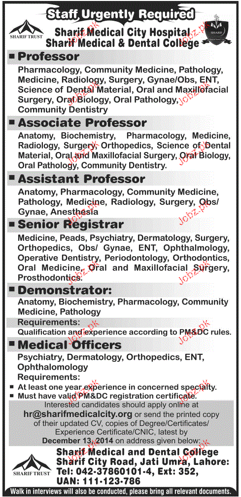 Professors, Associate Professors, Assistant Professor, demonstrators and Medical Officers are required in Sharif Medical and dental College in lahore.