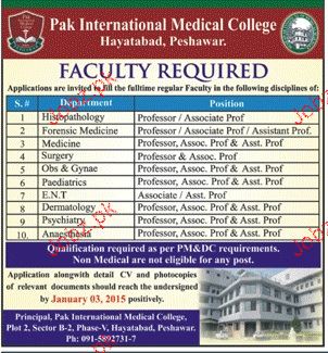 Professors, Associate Professors and Assistant Professor are required in Pak International Medical College in Peshawar.