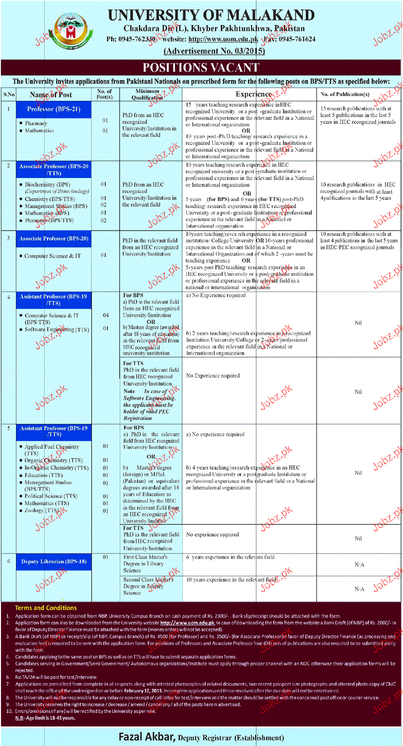 Professors, Associate Professors, Assistant Professor and Librarian are required in University of Malakand in Malakand.