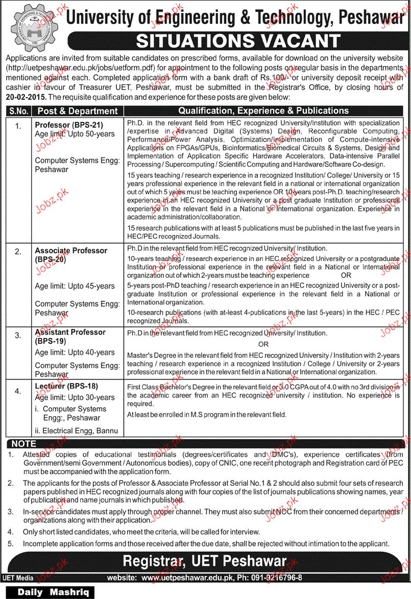 Professors, Associate Professors, Assistant Professor and Lecturers are required in University of Engineering & Technology in Peshawar.