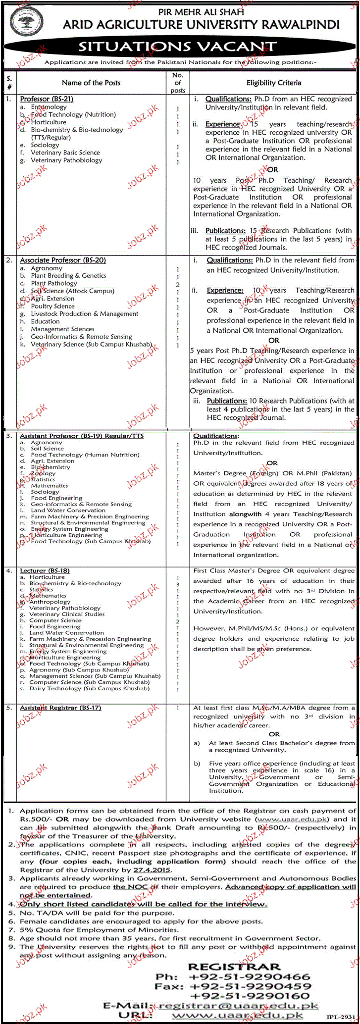Latest Arid Agriculture University Teaching Posts Rawalpindi 2025
