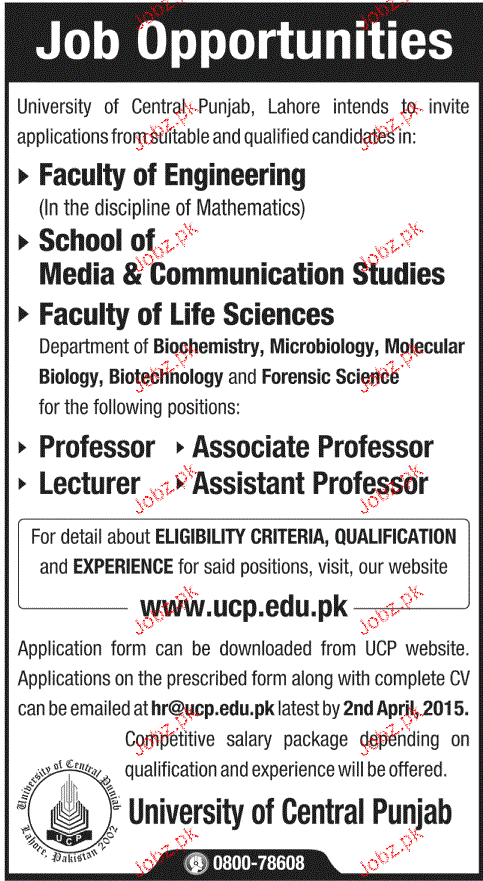 Professors, Associate Professors, Assistant Professor and Lecturers are required in University of Central Punjab in lahore.