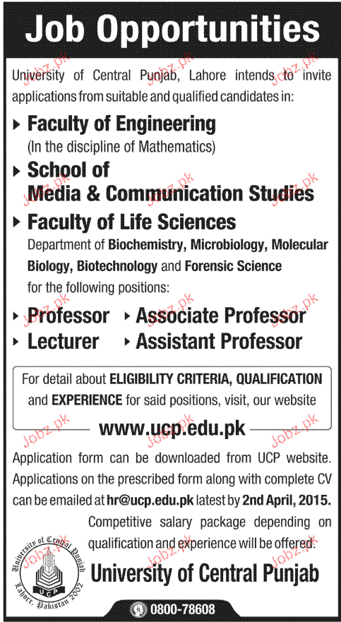 Professors, Associate Professors and Assistant Professor are required in University of Central Punjab in Lahore.