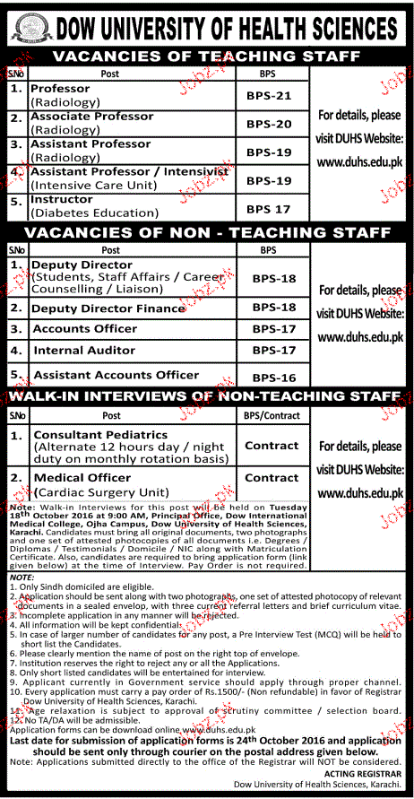 Professors, Associate Professors, Assistant Professor and Instructors are required in Dow University of Health Sciences in Karachi.