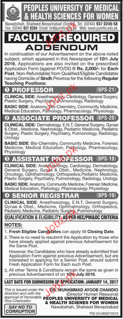 Professors, Associate Professors, Assistant Professor and Senior Registrar are required in Peoples University of Health Sciences in Nawab Shah.