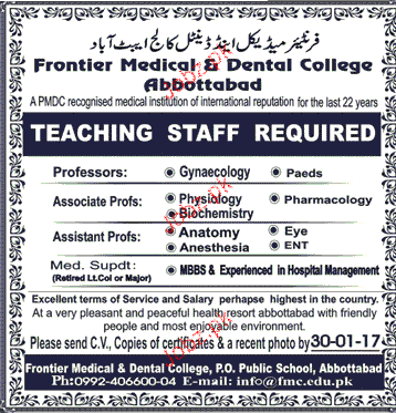 Professors, Associate Professors, Assistant Professor and Medical Superintendent are required in Abbottabad
