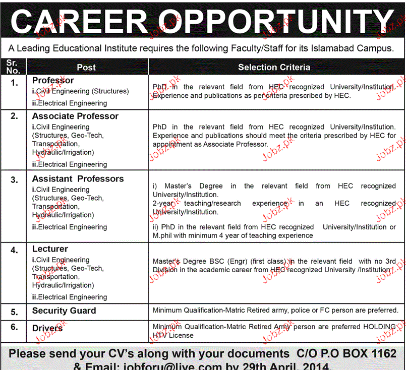 Apply as per details in job advertisement. Login to view further details of how to apply via https://www.jobz.pk online.