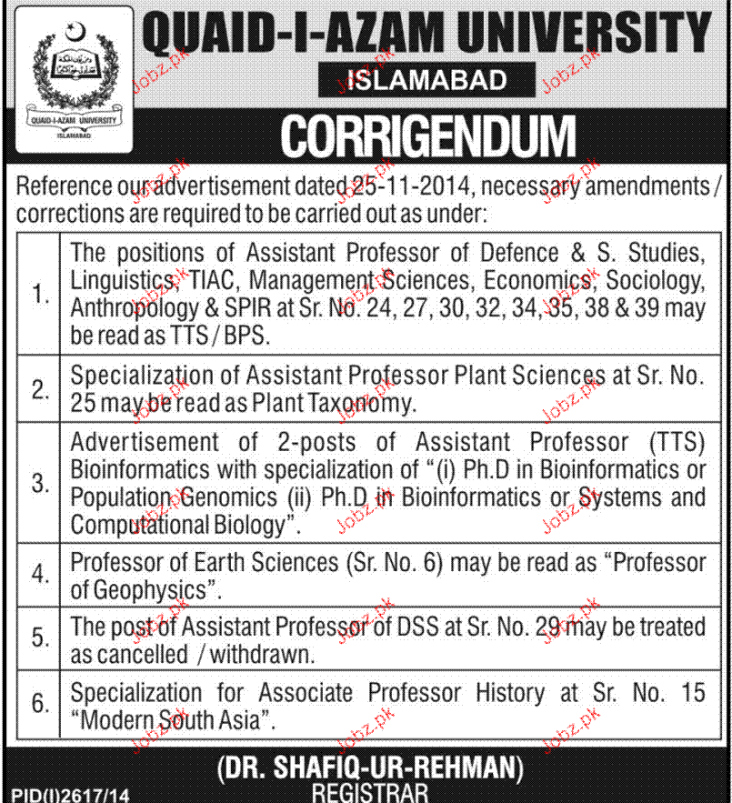 Professors, Associate Professors Job in Quaid-e-Azam univers