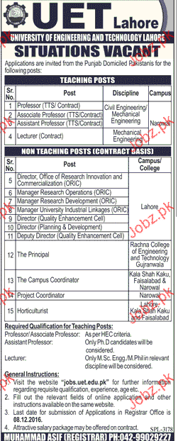 Professors, Associate Professors Job In UET Lahore