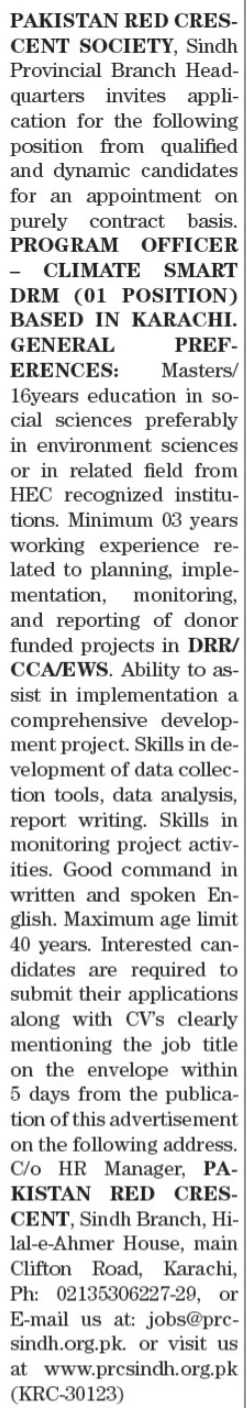 Vacant posts including program officer are announced in Pakistan Red Crescent Society PRCS Karachi, karachi Sindh Pakistan as per 24 January 2025 advertisement in daily The News Newspaper. Persons with Master etc. education can apply.