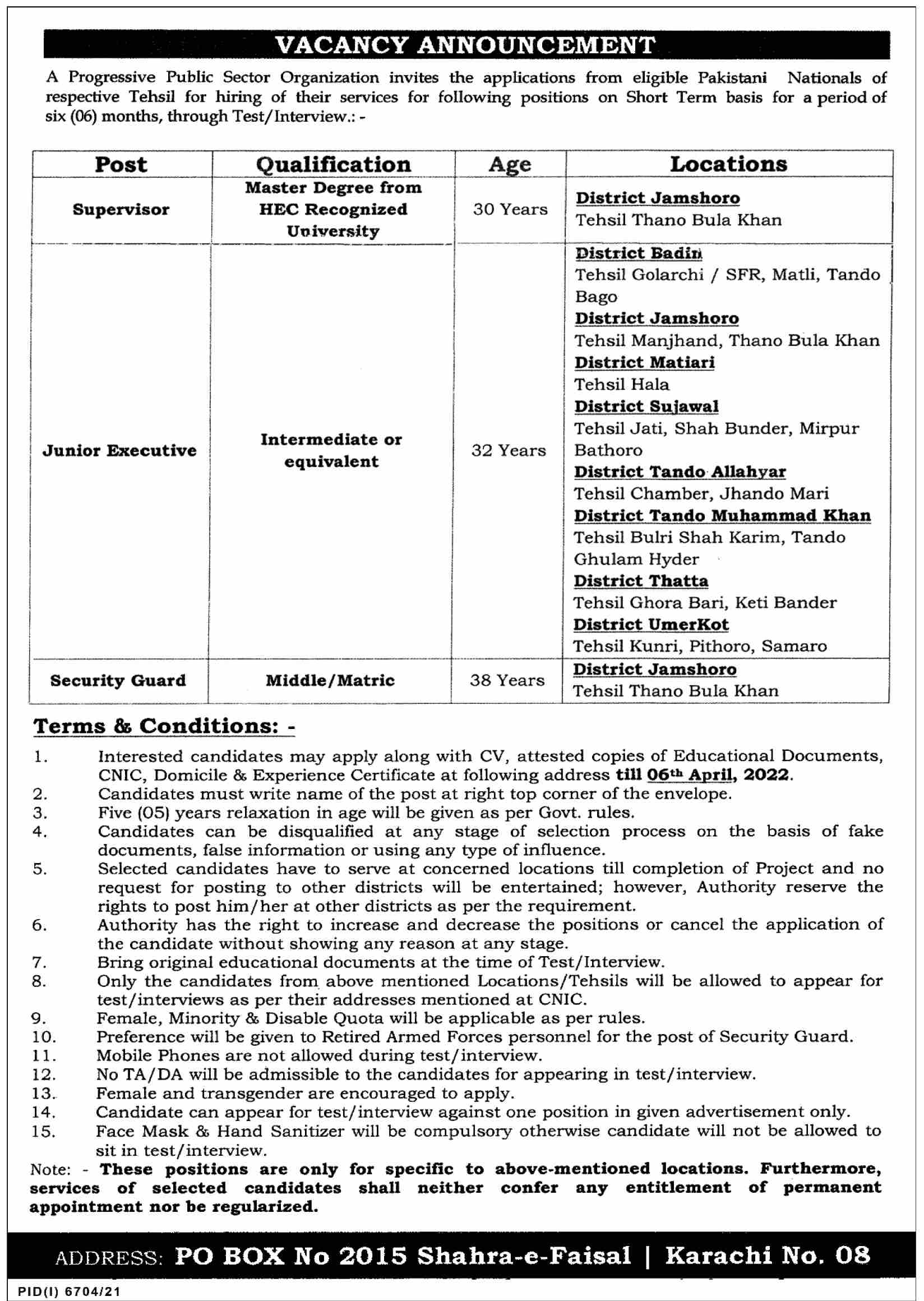 Progressive Public Sector Organization Jobs 2022 In Karachi