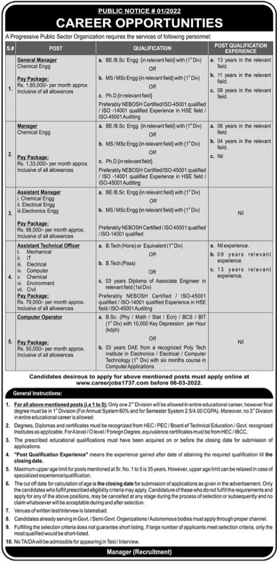 Public Sector Organization Islamabad, islamabad Islamabad Pakistan invites applications from eligible candidates for the post of general manager, assistant manager, manager, assistant technical officer and computer operator as per advertisement of February 20, 2022 published in daily Jang Newspaper. Educational qualifications required Master and Bachelor etc.