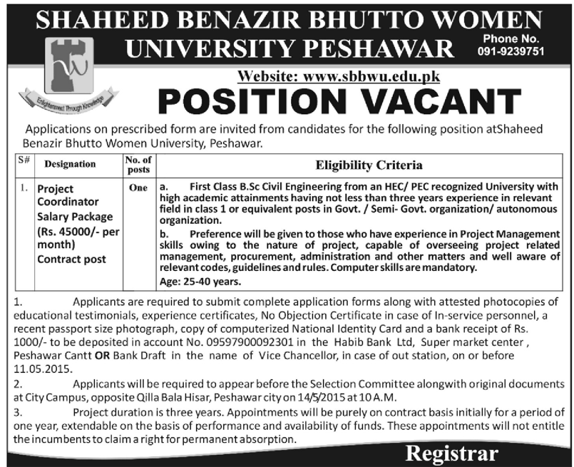 Project Coordinators are required in Shaheed Benazir Bhutto Women University in Peshawar.
