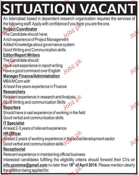 Apply as per details in job advertisement. Login to view further details of how to apply via https://www.jobz.pk online.