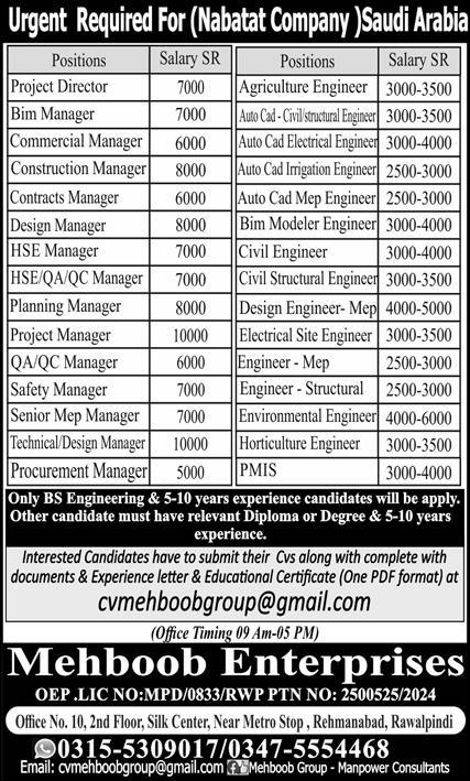 Vacant posts including design manager, engineer mep, planning manager, procurement manager, electrical site engineer, technical manager, civil structural engineer, structural engineer, agriculture engineer, qa manager, contracts manager, project manager, autocad civil engineer, environmental engineer, pmis, hse manager, project director, design engineer mep, construction manager, engineer structural, autocad mep engineer, bim manager, bim modeler engineer, qc manager, commercial manager, mep manager, autocad irrigation engineer, safety manager, horticulture engineer and civil engineer are announced in Mehboob Enterprises Overseas Employment Promoters Riyadh, riyadh Saudi Arabia as per 4 May 2024 advertisement in daily Express Newspaper. Educational qualifications required B.E, Master, Bachelor and Others etc.