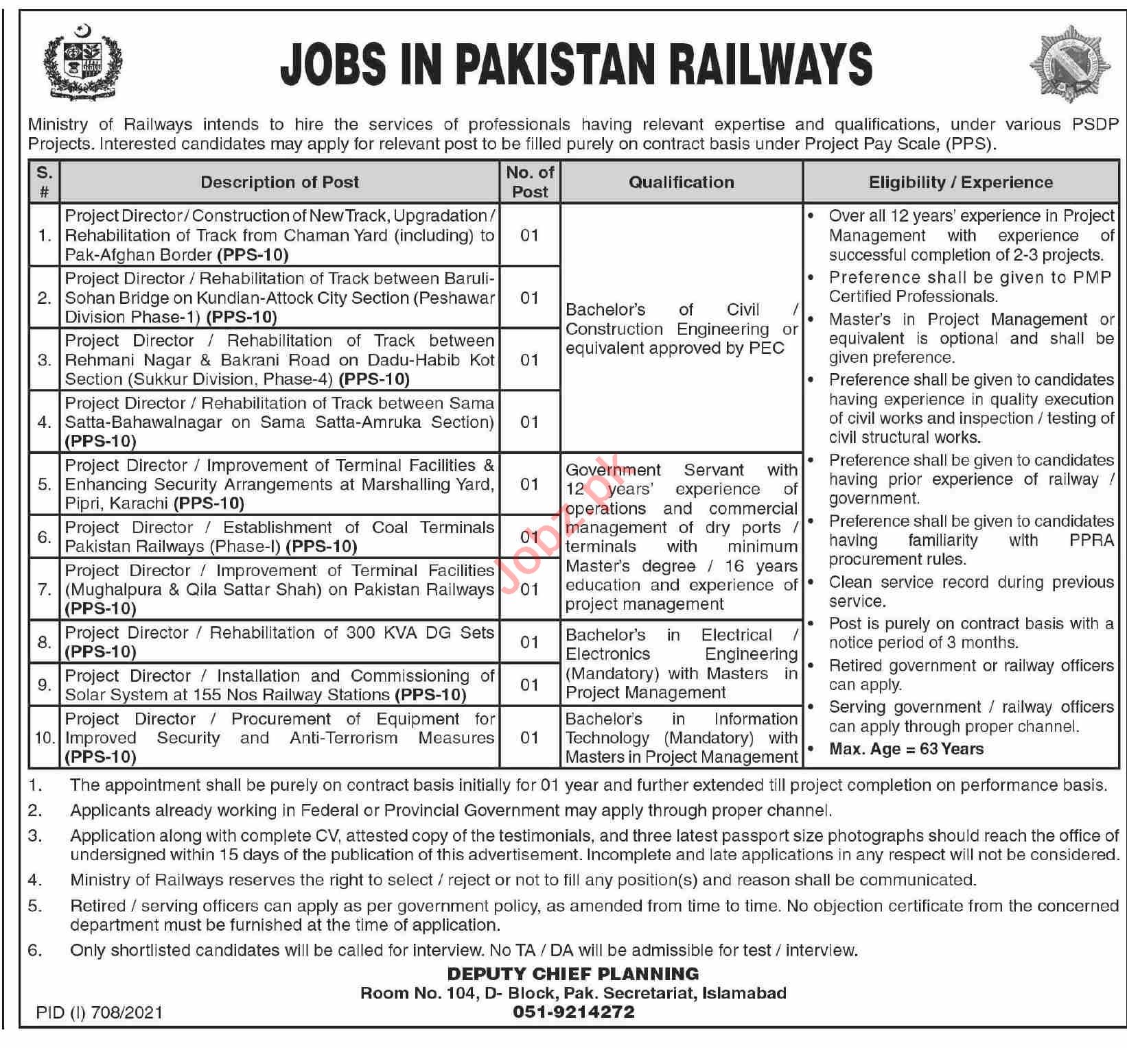 Project Director Jobs 2021 In Ministry Of Railways Islamabad