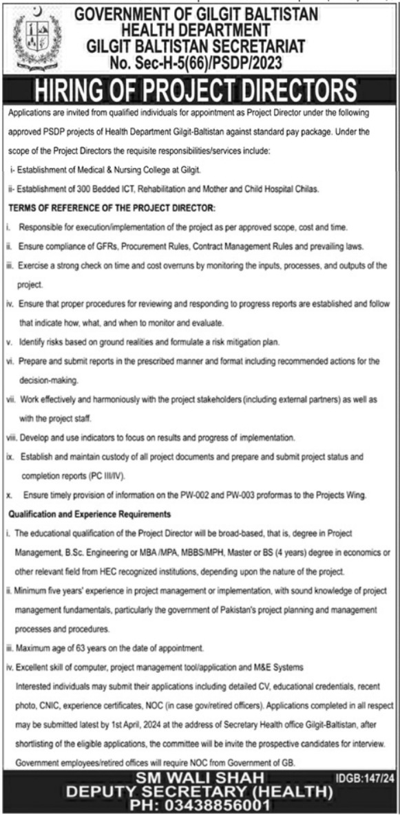 Health Department jobs advertisement dated about 9 March 2024 in daily Khabrain Newspaper invites application for the vacant post of project director in Gilgit, gilgit Gilgit Baltistan Pakistan. B.E, Master, MBBS and MBA etc. educational qualification will be preferred.