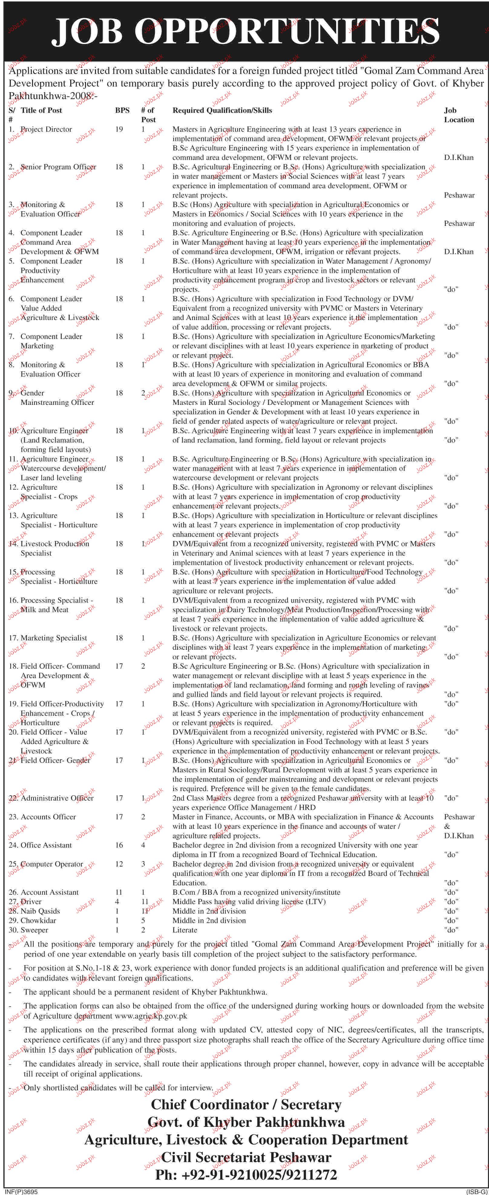 Project Director, Senior Program Officer, Monitoring & Evaluation Officers, Component Leaders, Gender Officers, Agriculture Officers, Agriculture Engineers, Agriculture Specialist and Marketing Specialist are required in Agriculture, Livestock & Cooperation Department in Peshawar.