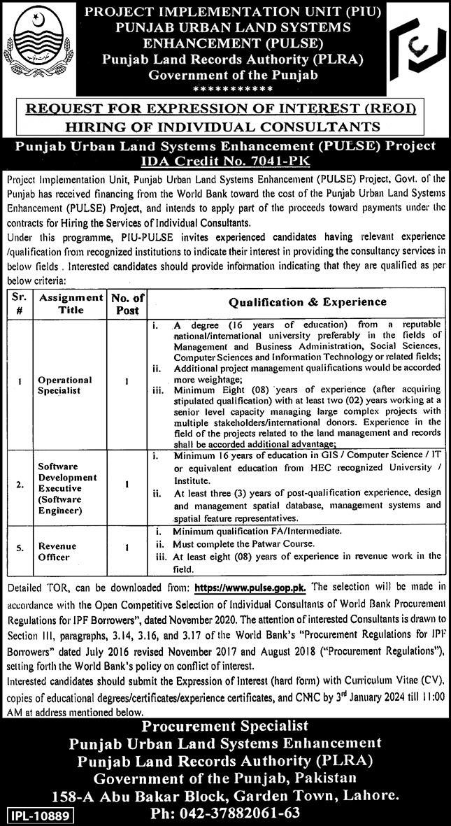 Project Implementation Unit PIU Lahore, lahore Punjab Pakistan invites applications from eligible candidates for the post of revenue officer, software development executive and operational specialist as per advertisement of December 21, 2023 published in daily Express Newspaper. Educational qualifications required Bachelor, Intermediate and Master etc.