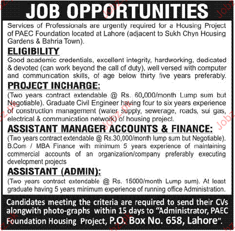 Project Incharge, Assistant Manger Accounts/Finance Required