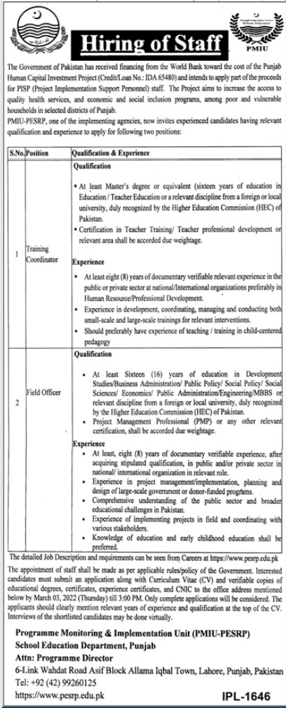 Project Management & Implementation Unit, School Education Department jobs advertisement dated about 15 February 2022 in daily Jang Newspaper invites application for the vacant post of Field Officer and Training Coordinator in Lahore Punjab Pakistan. M.com, Master and MBA etc. educational qualification will be preferred.