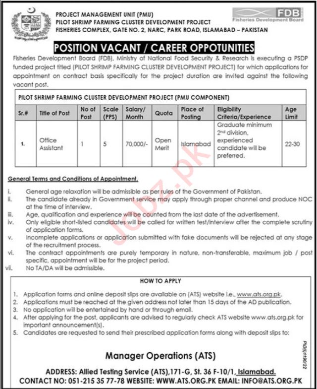 Fisheries Development Board Islamabad, islamabad Islamabad Pakistan invites applications from eligible candidates for the post of office assistant as per advertisement of August 28, 2022 published in daily The News Newspaper. Bachelor and Master etc. educational qualification will be preferred.