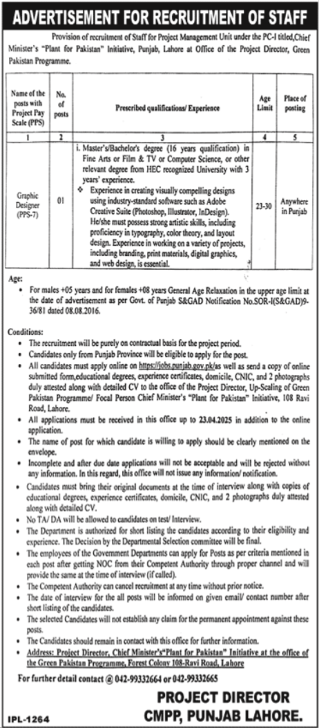 Vacant posts including graphic designer are announced in Project Management Unit PMU Lahore, lahore Punjab Pakistan as per 9 April 2025 advertisement in daily Jang Newspaper. Candidates with MS, Bachelor and Master etc. educational background will be preferred.