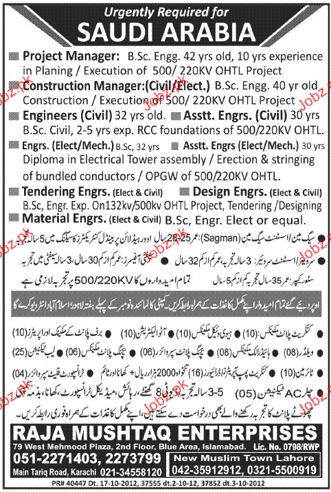Project Manager, Engineers, Construction Manager Required