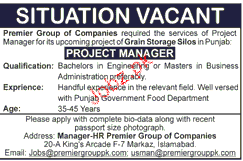 Premier Group of Companies require the service of Project Manager For upcoming Project of Grain Storage Store in Punjab. Minimum Bachelor in Engineering or Master in business Administration.