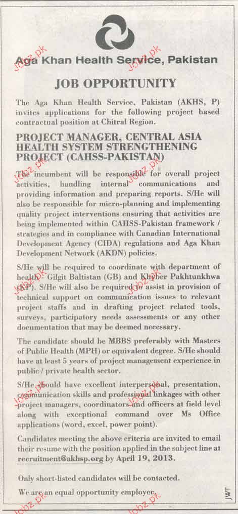 Project Manager is required in Aga Khan Health Services Pakistan in karachi