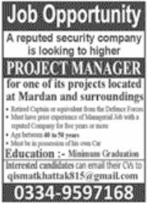 Security Company Mardan, mardan Khyber Pakhtunkhwa KPK Pakistan invites applications from eligible candidates for the post of project manager as per advertisement of June 4, 2025 published in daily Jang Newspaper. Candidates with Bachelor etc. educational background will be preferred.