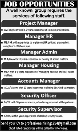 Private Company jobs advertisement dated about 12 October 2025 in daily Jang Newspaper invites application for the vacant post of security officer, manager admin, project manager, manager hr, accounts manager, security supervisor and manager housing in Lahore, lahore Punjab Pakistan. Persons with Intermediate, M.com, BA, Bachelor, MA, MBA, ACCA and Master etc. education can apply.