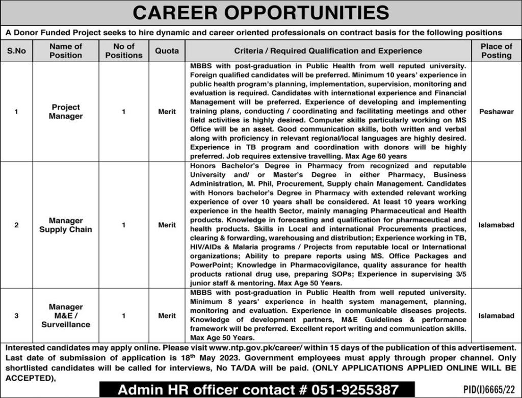 Donor Funded Project, Donor Funded Program, National TB Control Program NTP Islamabad, peshawar Islamabad Pakistan invites applications from eligible candidates for the post of project manager, manager supply chain, manager monitoring, manager evaluation and manage surveillance as per advertisement of May 4, 2023 published in daily Express Newspaper. M.sc, P.G Diploma, Mphil, MS, MBBS and Master etc. educational qualification will be preferred.