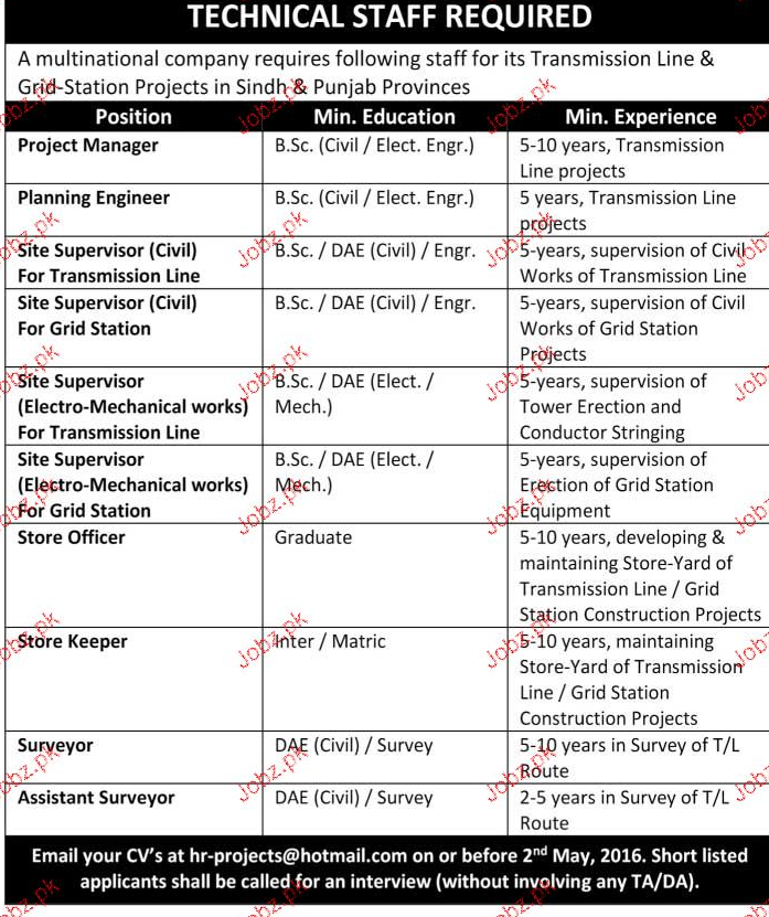 Project Manager, Planning Engineers, Site Supervisor, Store Officers and Store Keepers are required in Lahore.