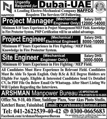 Arshman Manpower Bureau Dubai, tabuk Dubai invites applications from eligible candidates for the post of project manager, site engineer, project engineer and engineer as per advertisement of October 22, 2025 published in daily Express Newspaper. Preferred Education is B.E, Others, Bachelor and Intermediate etc.