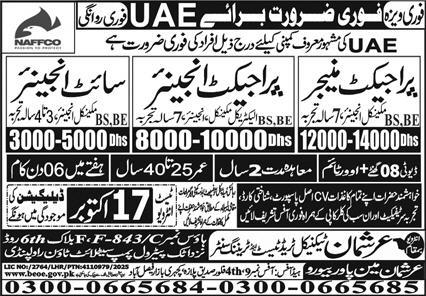 Arshman Technical Trade Test & Training Center Abu Dhabi, dubai UAE invites applications from eligible candidates for the post of mechanical engineer, site engineer, project manager, project engineer and electrical engineer as per advertisement of October 11, 2025 published in daily Express Newspaper. Candidates with Others, Bachelor, B.E and Intermediate etc. educational background will be preferred.