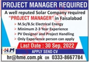 Project Manager Required In Solar Company Faisalabad