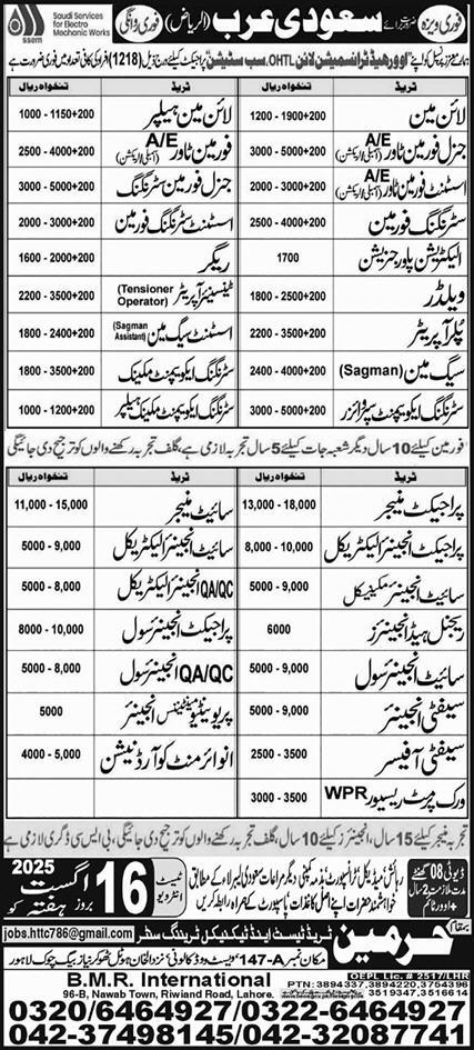 Harmain Trade Test & Technical Training Center Riyadh, dammam Saudi Arabia invites applications from eligible candidates for the post of site engineer electrical, project manager, assistant striking foreman, sagman, project engineer civil, striking foreman, assistant foreman tower, safety engineer, environment coordination, safety officer, foreman tower, site engineer mechanical, qc engineer civil, foreman tower assembly, qa engineer electrical, work permit receiver, lineman helper, site engineer civil, general foreman, qc engineer electrical, preventive maintenance engineer, qa engineer civil, assistant sagman, electrician power generation, site manager, rigger, project manager electrical, regional head engineer, lineman, puller operator, tensioner operator, general foreman tower assembly, assistant foreman and welder as per advertisement of August 15, 2025 published in daily Express Newspaper. Preferred Education is Matric, Intermediate, Others, Bachelor, B.E and DAE etc.