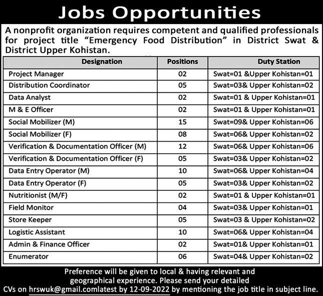 Non Governmental Organization NGO is looking for candidates for following posts as per job advertisement published in daily Express Newspaper of September 6, 2022 for location Swat, kohistan Khyber Pakhtunkhwa KPK Pakistan: