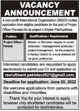 Vacant posts including project officer are announced in International Organization Peshawar, peshawar Khyber Pakhtunkhwa KPK Pakistan as per 1 June 2022 advertisement in daily Aaj Newspaper. Master and Bachelor etc. educational qualification will be preferred.