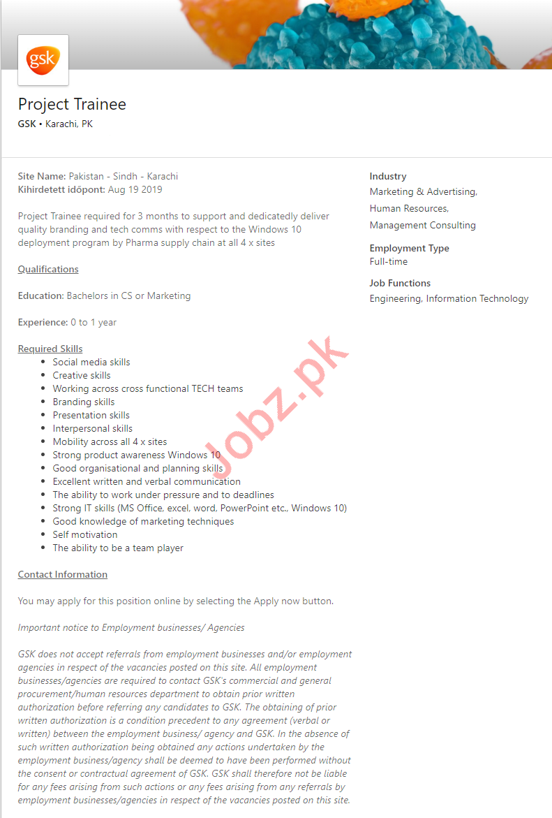 Apply as per details in job advertisement. Login to view further details of how to apply via https://www.jobz.pk online.