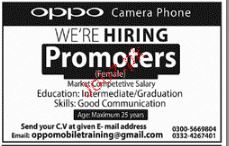 Male / Female Promoters are required in Oppo Camera Phone in Lahore. Send your Application with all Education certificates, Photographs, Domicile and copy of CNIC.